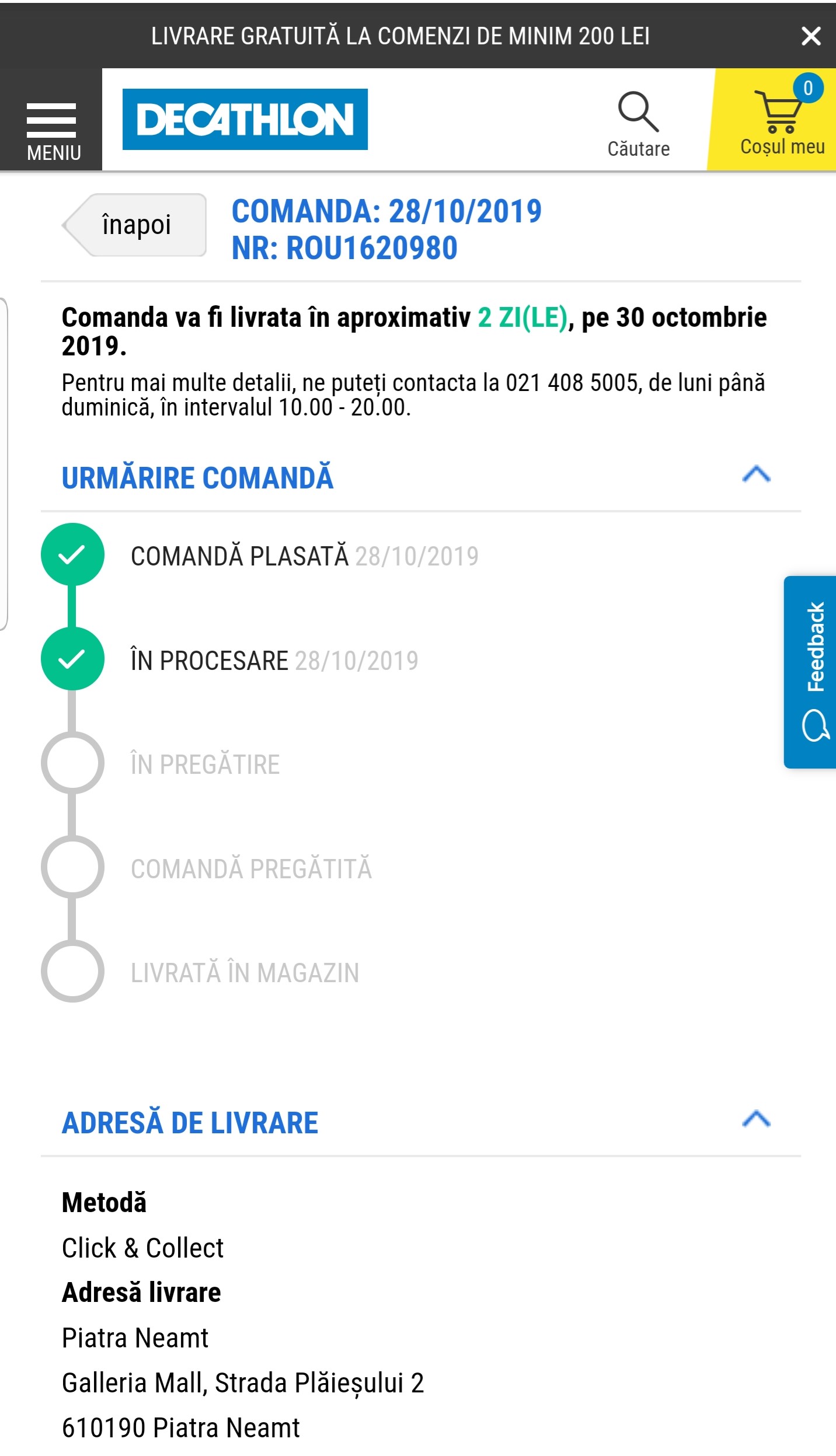Așa că mi-am ales produsele pe site-ul DECATHLON, am ales metoda de livrare CLICK & COLLECT, am plătit cu cardul și bam, chiar a doua zi am primit notificare pe email, dar și apel telefonic că îmi pot ridica produsele din magazin. În mod normal fusesem avertizat la momentul plasării comenzii că produsele vor sosi în 2 zile și iată că totul a decurs extrem de ușor și mult mai rapid.