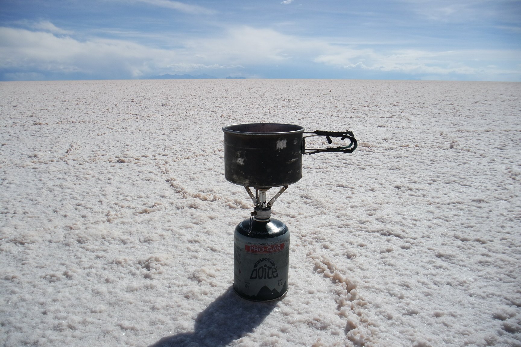 N-am apucat să dorm la cort în Salar, fiind destul de dificil să bat cuiele de ancorare, dar am compensat cu o găteală, la primus.